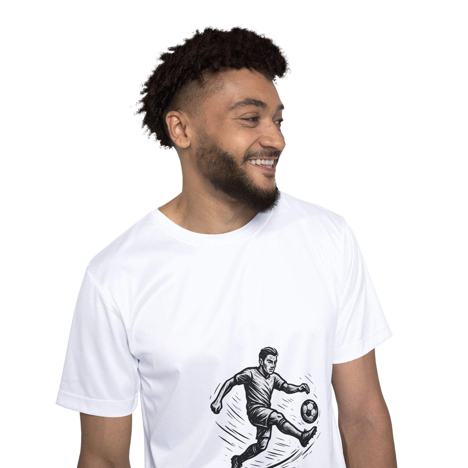 Model in game-day pose showcasing breathable men’s football t-shirt – ideal for online store presentation.