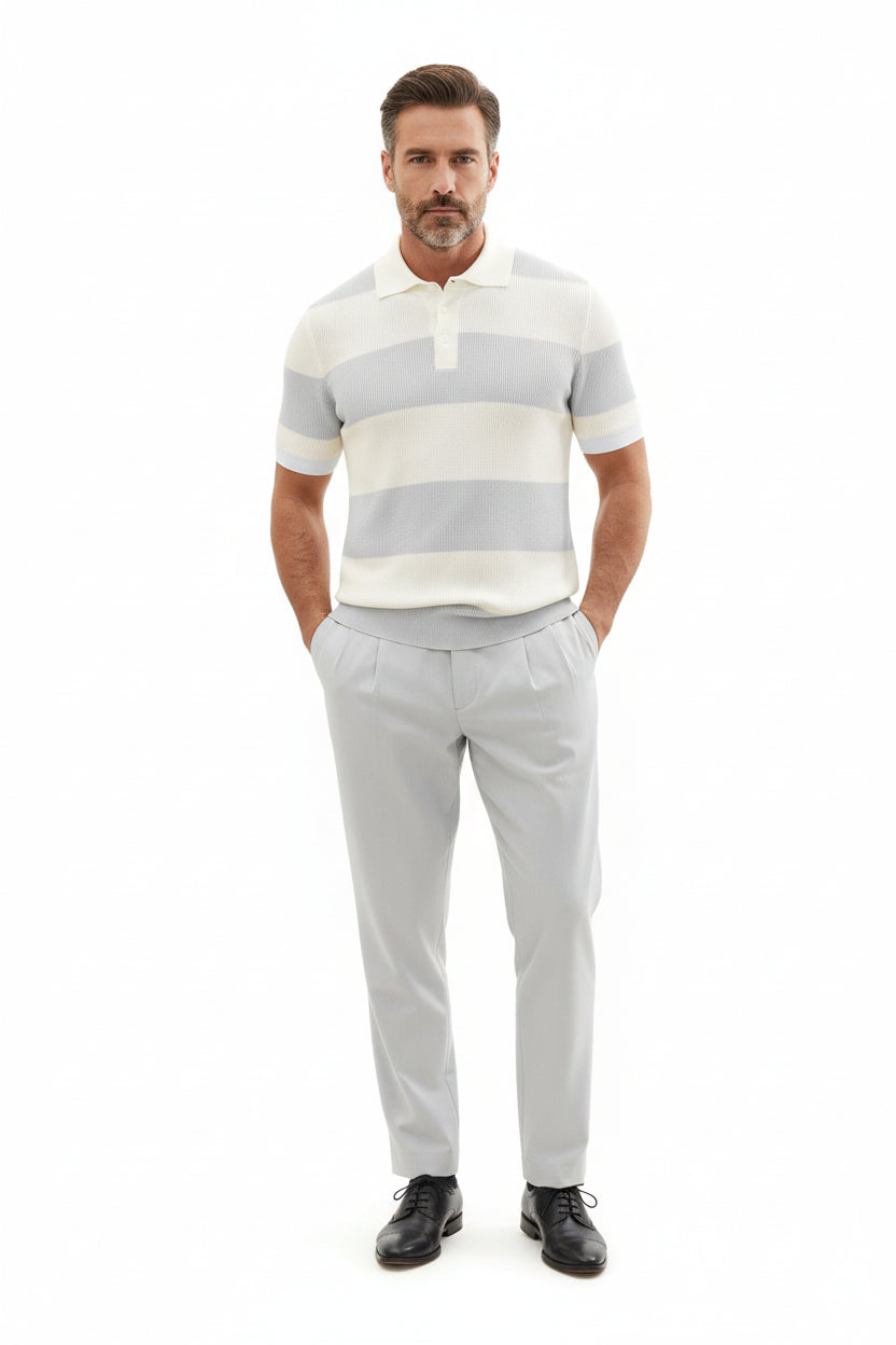 Men’s Short Sleeve Lapel Sweater designed for men who want a polished summer look without sacrificing comfort. The slim silhouette, refined lapel collar, and clean color-block splicing create a modern European aesthetic that feels effortless yet elevated.