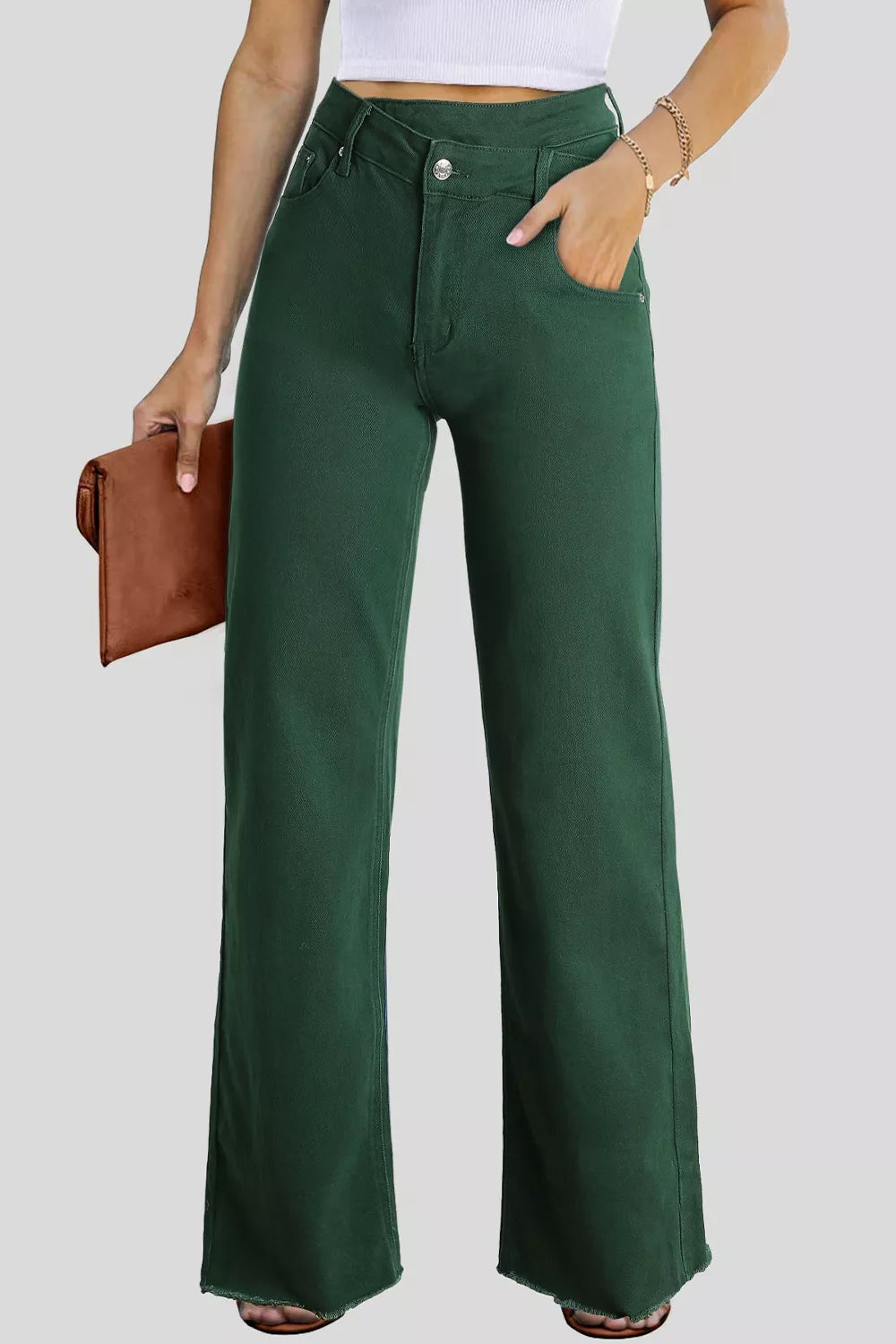 Wear them with a slim tank and heels for a sharper evening look, or add a tucked tee and sneakers for off-duty styling. They also work well with a blazer, a cropped jacket, or a soft knit when you want denim that looks more intentional. The crossed waistband does the styling work for you, so even simple outfits feel more put together.