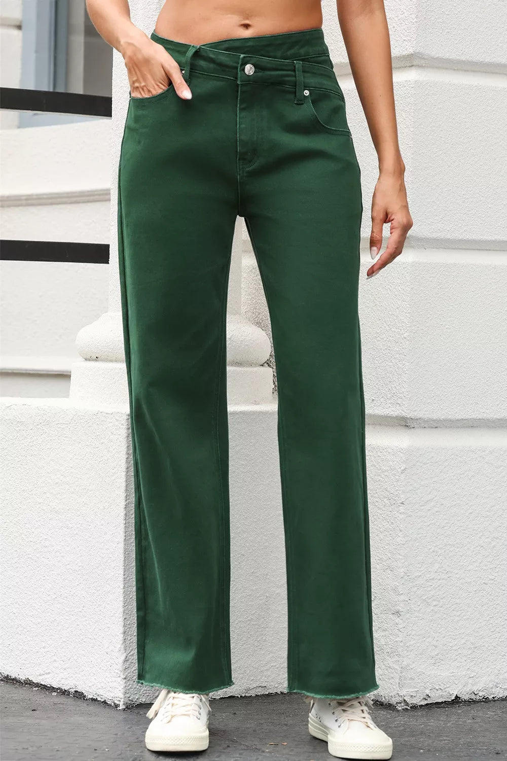 Clean lines, a modern crossed waistband, and a raw hem give these jeans an instant outfit upgrade. These crossover waist jeans bring more shape to everyday denim without feeling overdone.