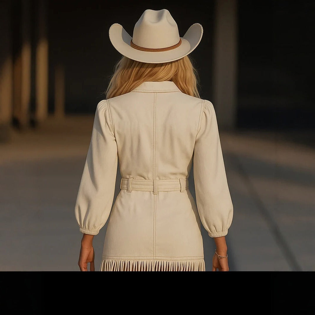 | S–3XL | Polyester (denim-look) | Street, parties, dates, travel | V-neck, puff sleeve, tassel hem, mid-waist |