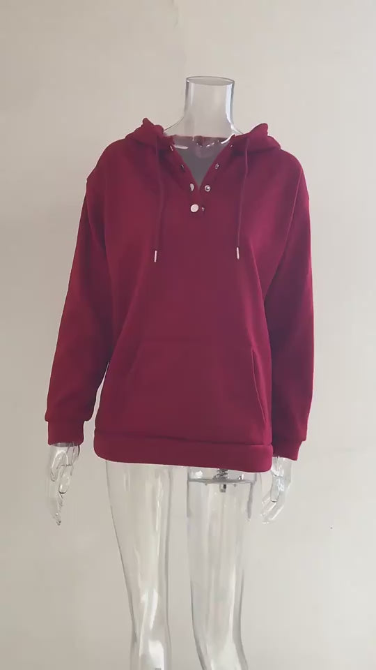 Style in one easy layer – this women’s hooded sweatshirt pairs a clean, casual silhouette with a soft cotton-blend feel. The loose fit drapes naturally, the button neckline adds polish, and the drawstring hood keeps it sporty. Choose your shade – purple, gray, black, wine red, army green, blue, light green, navy, or apricot – and make the women’s hooded sweatshirt your everyday go-to.