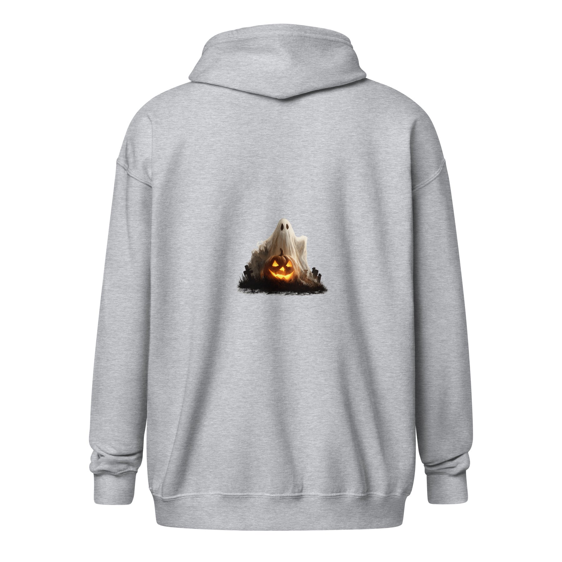 Gray unisex zip hoodie with ghost and pumpkin design