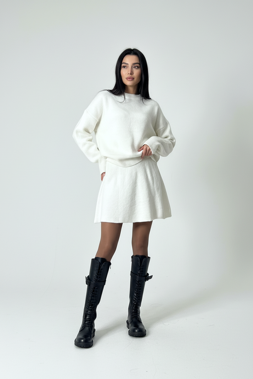 This set balances softness and structure in a way that feels natural on the body. The long sleeve pullover drapes cleanly, while the high waist A line mini skirt defines the waist and creates a longer leg line.